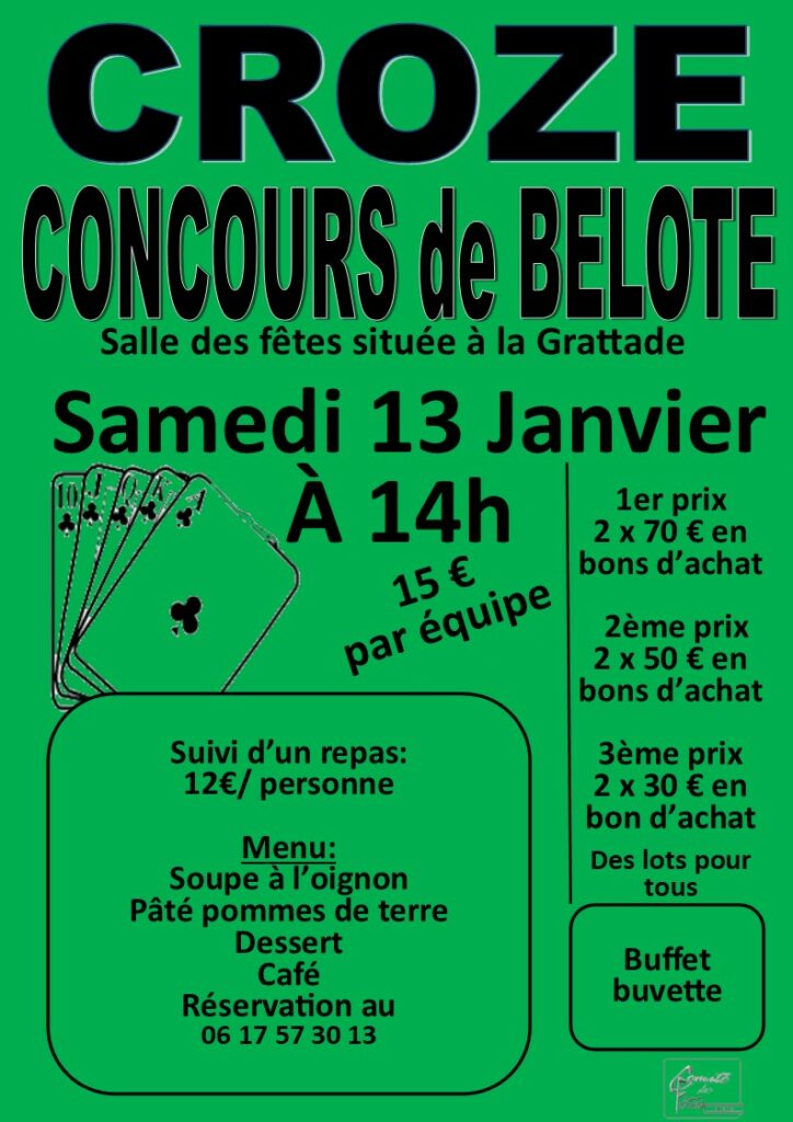 Le comité des fêtes de CROZE propose un concours de belote le samedi 13 janvier 2024 à 14h en la salle des fêtes de CROZE.