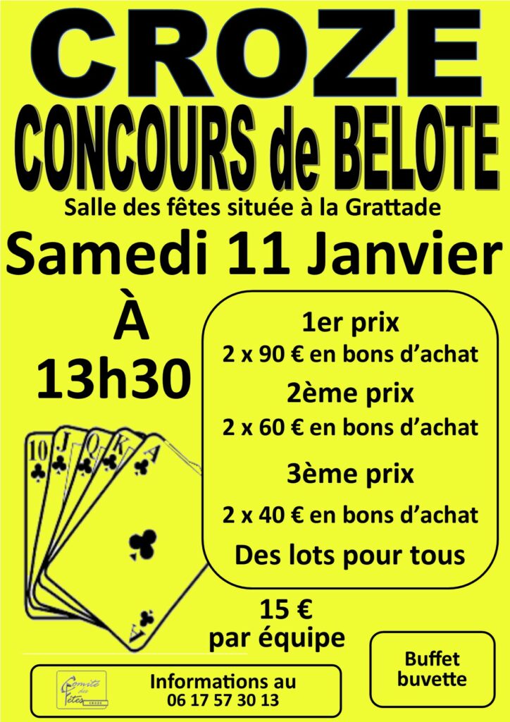 Le comité des fêtes organise son concours annuel le samedi 11 janvier 2025 à 13h30 à la salle des fêtes de Croze. Concours ouvert à tous, 15€ par équipe , possibilité de trouver un ou une partenaire sur place. On vous attend nombreux.