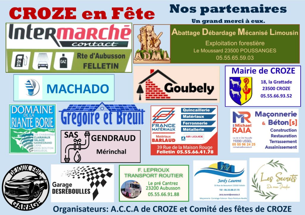 L’ACCA de CROZE et le comité des fêtes remercient très chaleureusement tous leurs partenaires sans lesquels le week-end : « CROZE EN FETE » n’aurait pu avoir lieu.